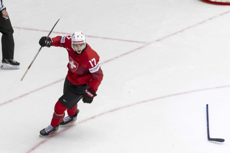 Švajčiarsky útočník Ken Jäger sa teší zo svojho gólu na 3:0 v zápase proti Rakúsku vo štvrťfinále MS v hokeji 2025. Herning (Jyske Bank Boxen), 22. máj 2025. Foto: Salvatore Di Nolfi/Keystone via AP.