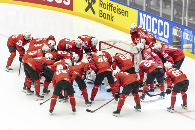 Hráči Švajčiarska pred štvrťfinálovom zápase proti Rakúsku na MS v hokeji 2025. Herning (Jyske Bank Boxen), 22. máj 2025. Foto: Salvatore Di Nolfi/Keystone via AP.