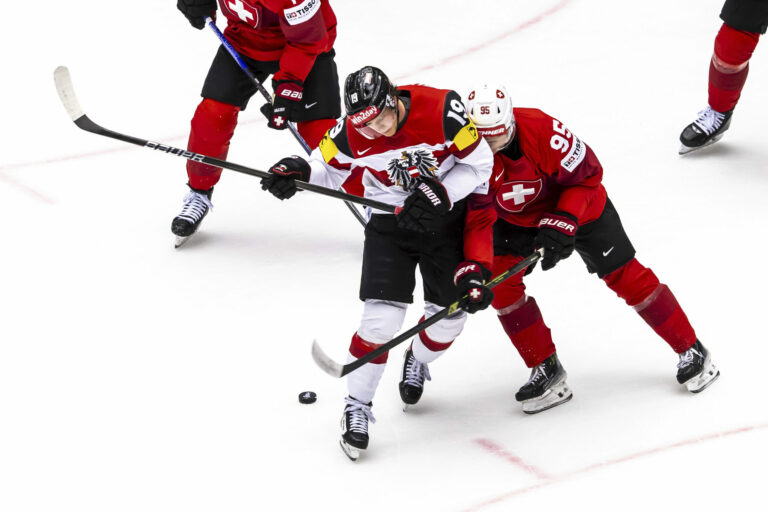 Rakúsky útočník Vinzenz Rohrer v súboji so Švajčiarom Tylerom Moyom počas štvrťfinálového zápasu na MS v hokeji 2025. Herning (Jyske Bank Boxen), 22. máj 2025. Foto: Salvatore Di Nolfi/Keystone via AP.