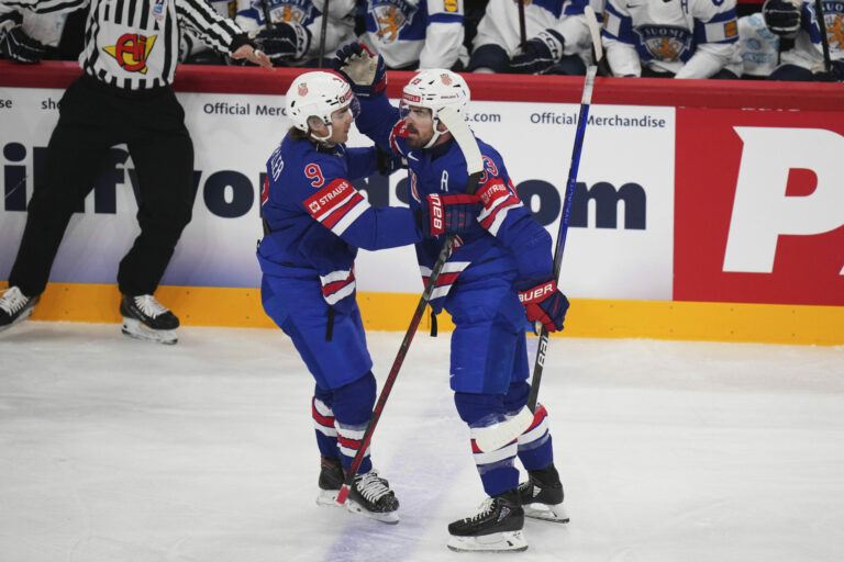 Americký útočník Conor Garland sa so spoluhráčom Claytonom Kellerom (9) teší zo svojho gólu na 1:0 v zápase proti Fínsku vo štvrťfinále MS v hokeji 2025. Štokholm (Avicii Arena), 22. máj 2025. Foto: SITA/AP.