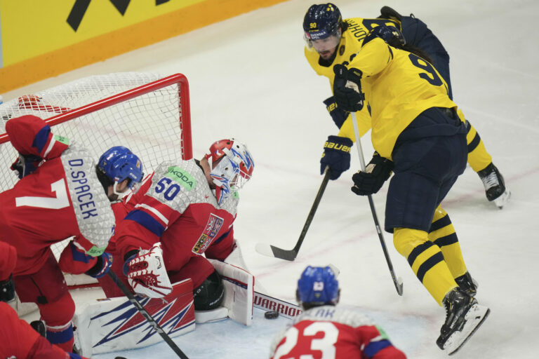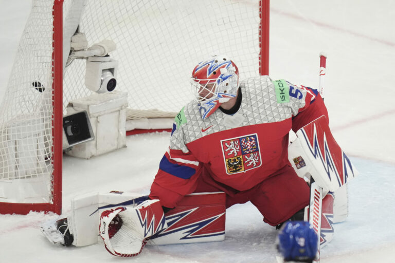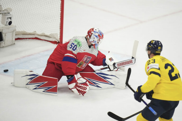 Zákrok brankára Karla Vejmelku v zápase proti Česku vo štvrťfinále MS v hokeji 2025. Štokholm (Avicii Arena), 22. máj 2025. Foto: SITA/AP.