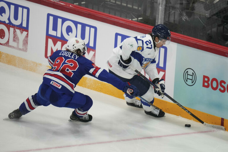 Americký útočník Logan Cooley sa snaží obrať o puk Fína Mikaela Pyyhtiäho (27) vo štvrťfinálovom zápase na MS v hokeji 2025. Štokholm (Avicii Arena), 22. máj 2025. Foto: SITA/AP.