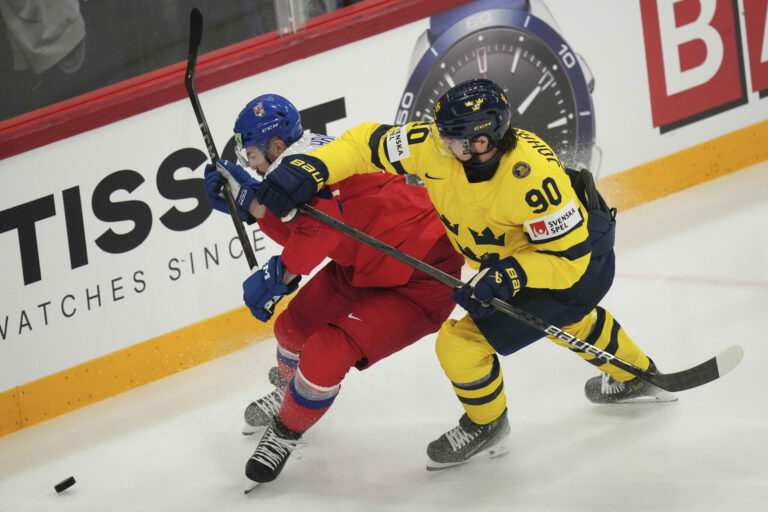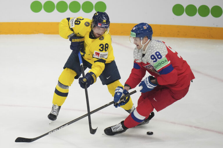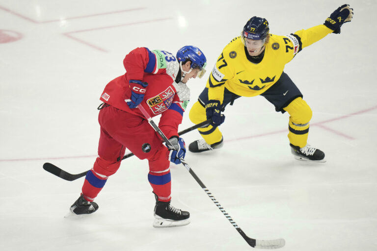Český útočník Lukáš Sedlák (23) a Švéd Simon Edvinsson počas štvrťfinálového zápasu na MS v hokeji 2025. Štokholm (Avicii Arena), 22. máj 2025. Foto: SITA/AP.