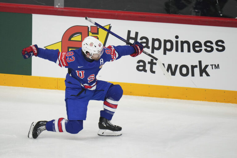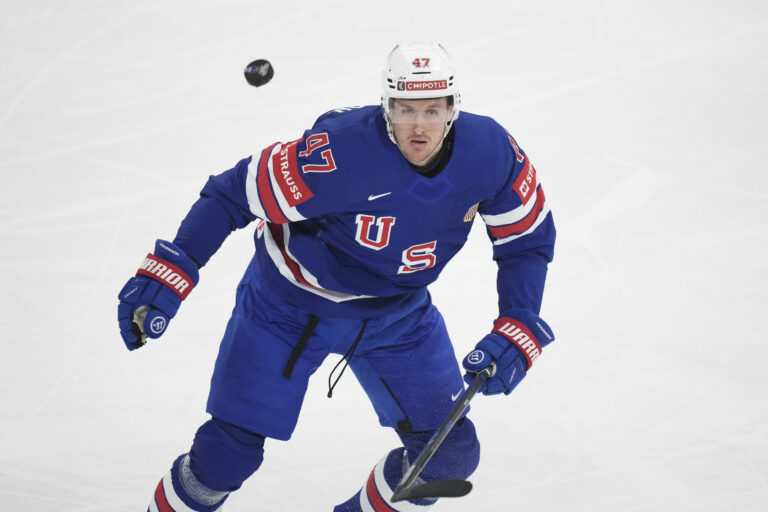Američan Michael McCarron (47) v zápase proti Fínsku vo štvrťfinále MS v hokeji 2025. Štokholm (Avicii Arena), 22. máj 2025. Foto: SITA/AP.