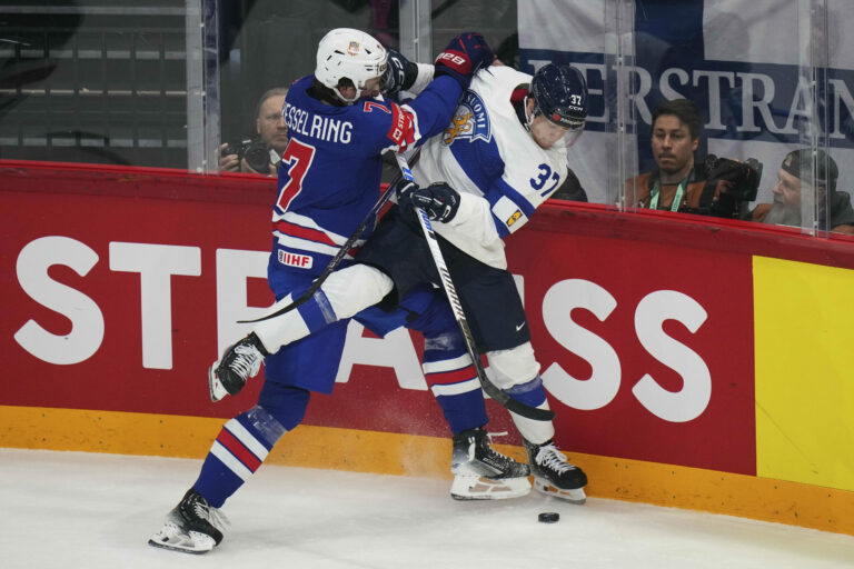 Fín Atro Leppanen (37) v súboji s Američanom Michaelom Kesselringom (7) vo štvrťfinálovom zápase na MS v hokeji 2025. Štokholm (Avicii Arena), 22. máj 2025. Foto: SITA/AP.