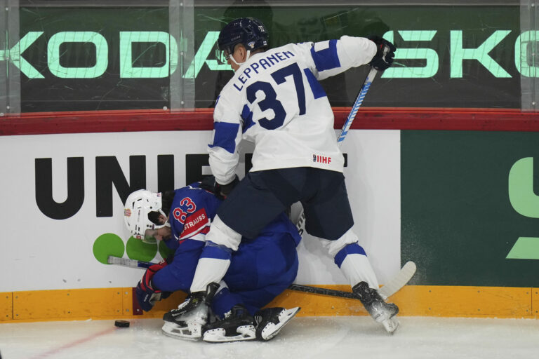 Fín Atro Leppanen (37) v súboji s americkým útočníkom Conorom Garlandom (83) vo štvrťfinálovom zápase na MS v hokeji 2025. Štokholm (Avicii Arena), 22. máj 2025. Foto: SITA/AP.