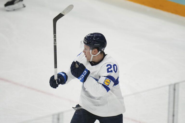 Fínsky útočník Eeli Tolvanen (20) sa teší z gólu na 1:1 v zápase proti USA vo štvrťfinále MS v hokeji 2025. Štokholm (Avicii Arena), 22. máj 2025. Foto: SITA/AP.