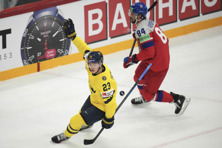 Švédsky útočník Lucas Raymond (23) sa teší zo svojho gólu na 2:0 v zápase proti Česku vo štvrťfinále MS v hokeji 2025. Štokholm (Avicii Arena), 22. máj 2025. Foto: SITA/AP.