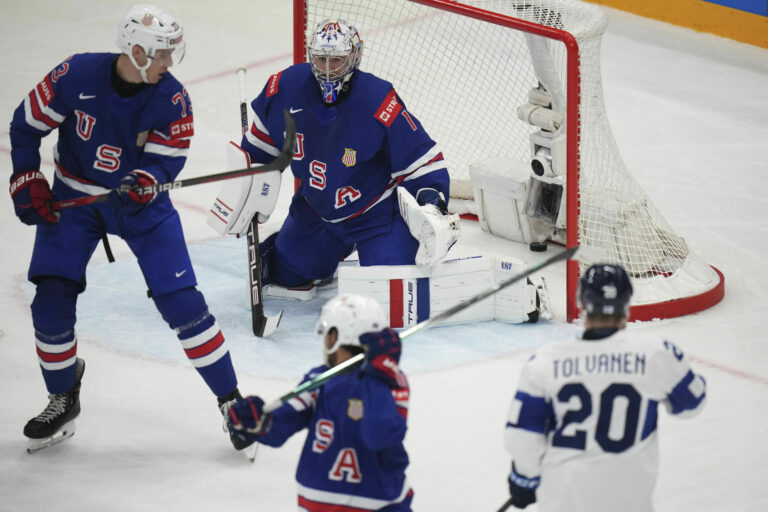 Gól fínskeho útočníka Eeliho Tolvanena (20) na 1:1 v zápase proti USA vo štvrťfinále MS v hokeji 2025. Štokholm (Avicii Arena), 22. máj 2025. Foto: SITA/AP.