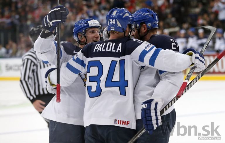 Radosť fínskych hokejistov po góle v sieti Bieloruska počas štvrtkového zápasu na svetovom šampionáte v Minsku. Foto: SITA/AP