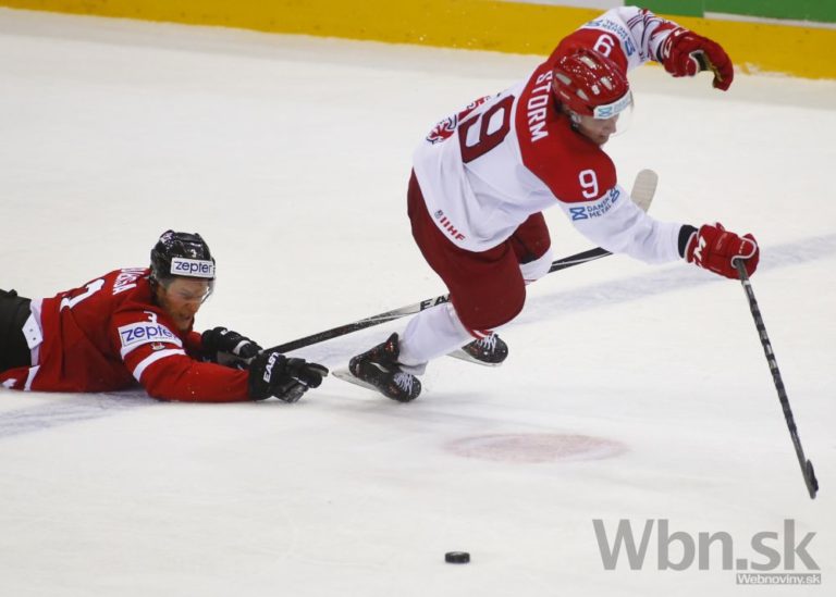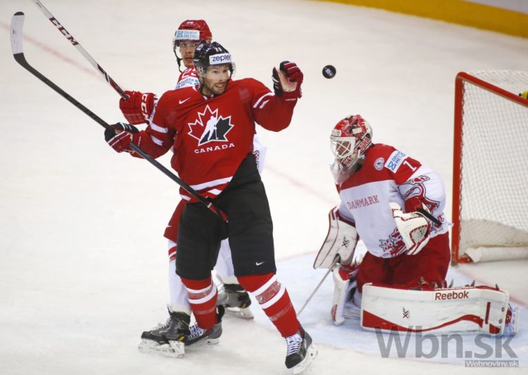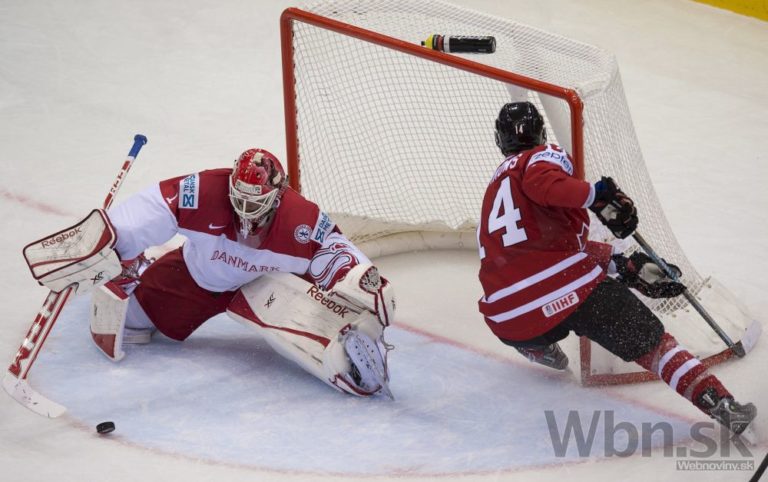 Kanaďan Alex Burrows sa snaží prekonať dánskeho brankára Patricka Galbraitha počas zápasu na MS v Minsku. Foto: SITA/AP