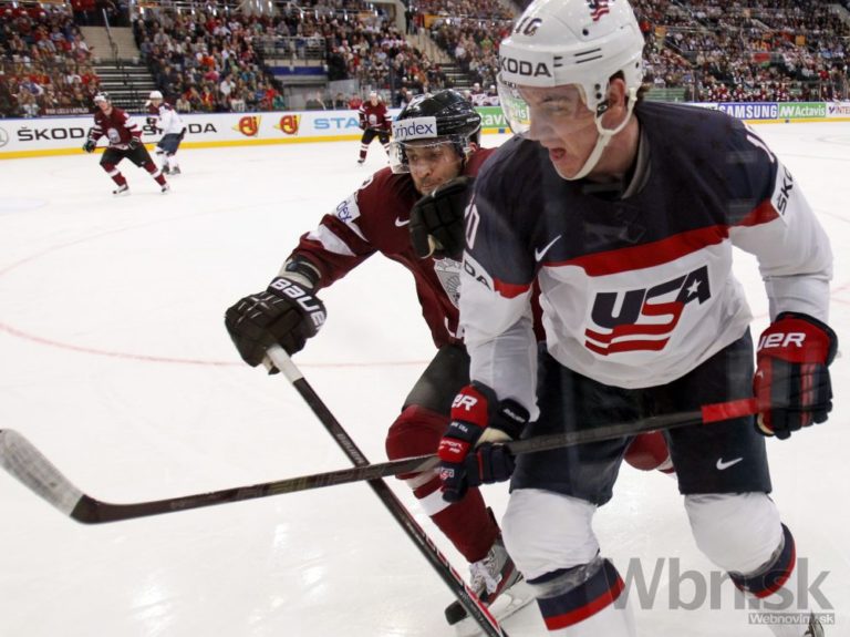 Americký útočník Jimmy Hayes v súboji s lotyšským útočníkom Marisom Jassom počas štvrtkového zápasu na MS v hokeji. Foto: SITA/AP