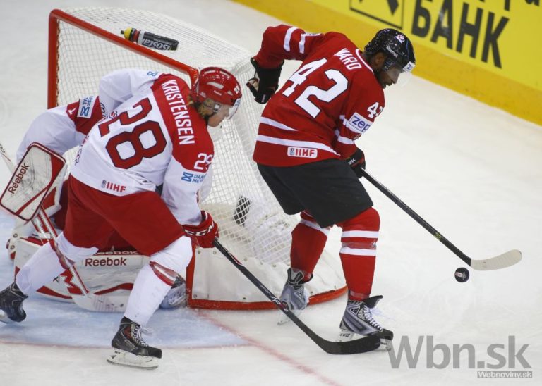 Kanaďan Joel Ward (vpravo) v súboji za dánskou bránou počas zápasu na MS v Minsku. Foto: SITA/AP