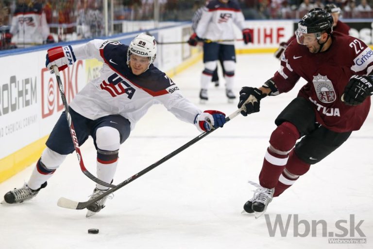 Útočník USA Brock Nelson (vpravo) v súboji s Lotyšom Jekabsom Redlihsom počas MS v Minsku. Foto: SITA/AP