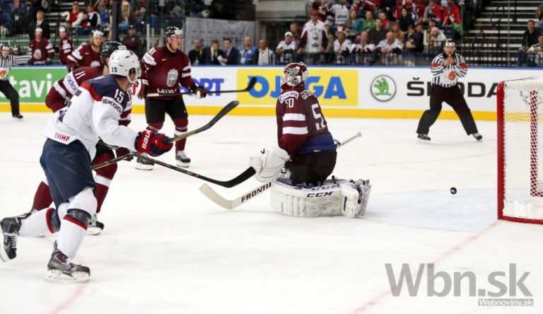 Brankár Lotyšska Kristers Gudlevskis inkasuje gól v zápase proti USA počas MS v Minsku. Foto: SITA/AP
