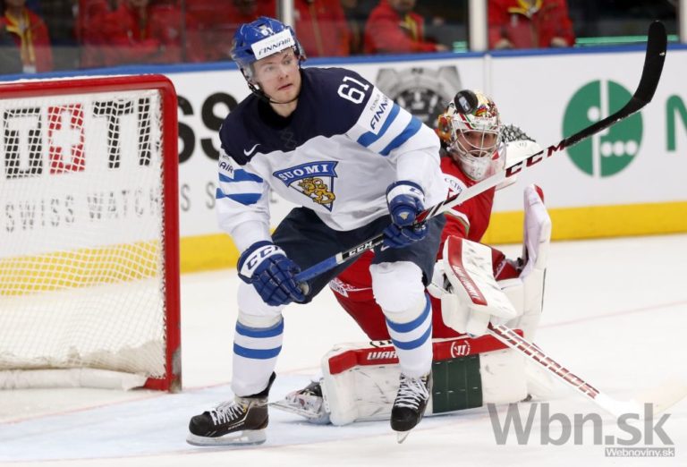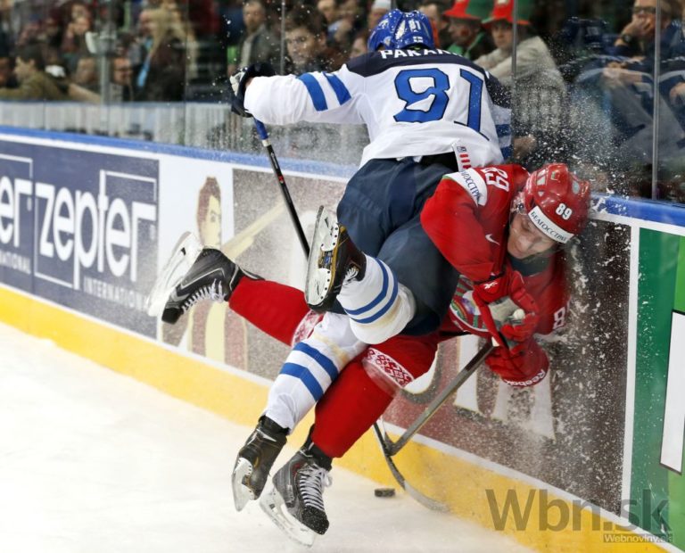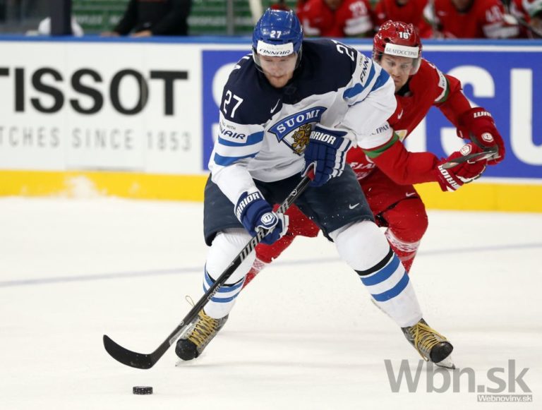 Fínsky útočník Iiro Pakarinen v súboji s bieloruským obrancom Dmitrim Korobovom počas štvrtkového zápasu na MS v hokeji. Foto: SITA/AP