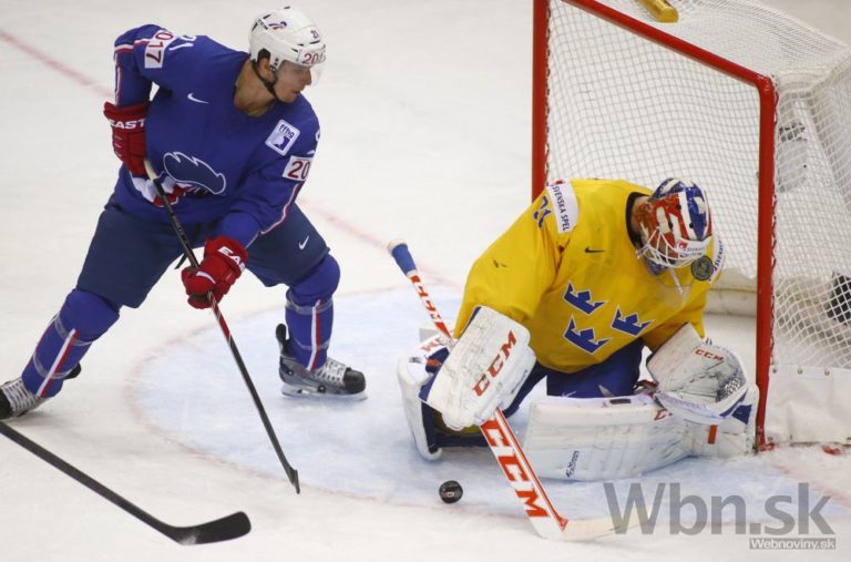 Francúzsky útočník Antoine Roussel sa snaží doraziť puk za švédskeho brankára Andersa Nilssona počas štvrtkového zápasu na MS v hokeji. Foto: SITA/AP