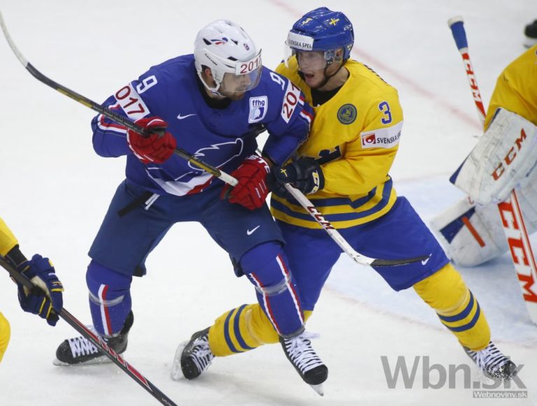 Švéd Niclas Burström v súboji s francúzskym útočníkom Damienom Fleurym počas štvrtkového zápasu na MS v hokeji. Foto: SITA/AP