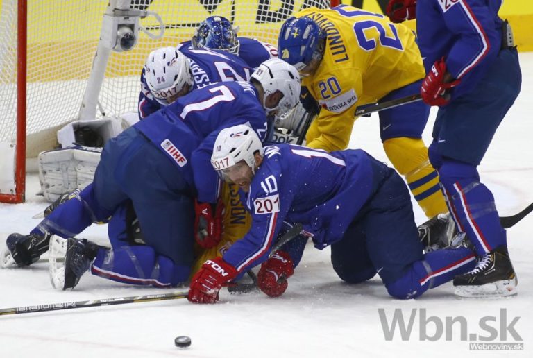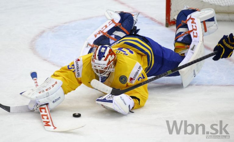Zákrok švédskeho brankára Andersa Nilssona počas štvrtkového zápasu proti Francúzsku na MS v hokeji. Foto: SITA/AP