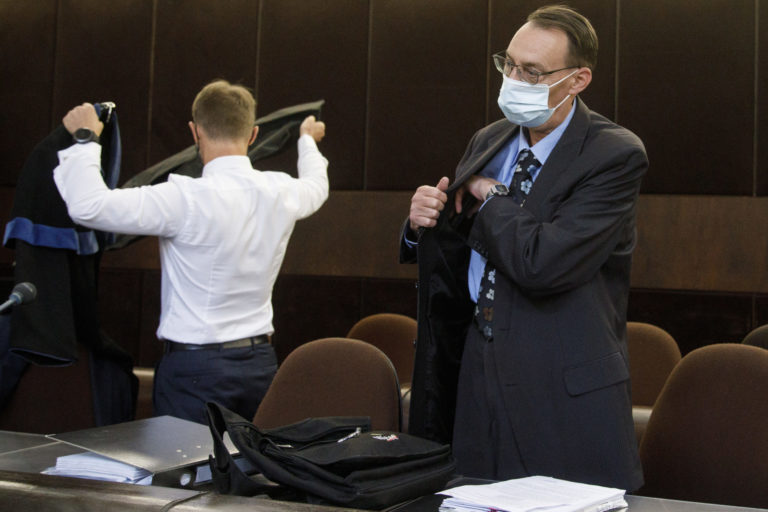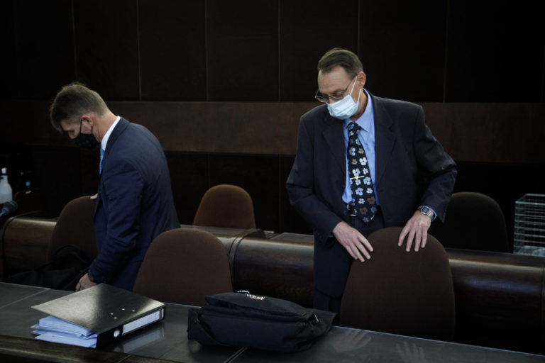 Obvinený bývalý generálny prokurátor Dobroslav Trnka (vľavo) počas príchodu na hlavné pojednávanie s obvineným, ktorý je obžalovaný pre zločin zneužívania právomoci verejného činiteľa. Bratislava, 6. september 2021. Foto: SITA/Branislav Bibel