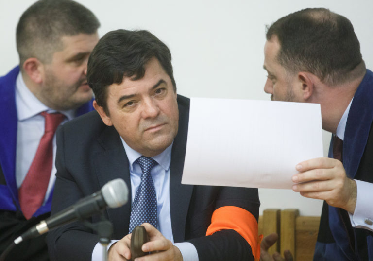 Zľava: Podnikateľ Marian K. a obhajca Marek Para počas hlavného pojednávania v kauze falšovania zmeniek TV Markíza v Ústave na výkon väzby a Ústave na výkon trestu odňatia slobody v Bratislave. Bratislava, 4. november 2019 Foto: SITA/Branislav Bibel