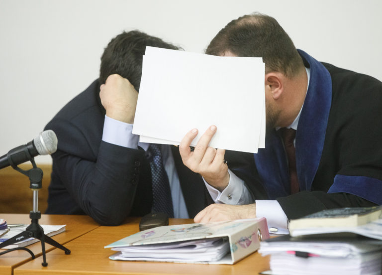Advokát Michal Mandzák a podnikateľ Marian Kočner počas hlavného pojednávania v kauze falšovania zmeniek TV Markíza v Ústave na výkon väzby a Ústave na výkon trestu odňatia slobody v Bratislave. Bratislava, 4. november 2019. Foto: SITA/Branislav Bibel.