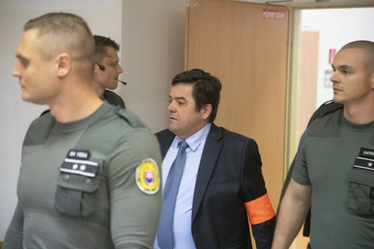 Obvinený exriaditeľ televízie Markíza Pavol R. (uprostred) pred začiatkom hlavného pojednávania v kauze falšovania zmeniek TV Markíza na Špecializovanom trestnom súde v Ústave na výkon väzby a Ústave na výkon trestu odňatia slobody. Bratislava, 17. október 2019. Foto: SITA/Martin Medňanský.
