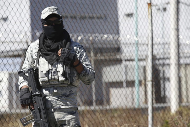 Mexická národná garda stráži pred väznicou Almoloya, kde je zadržiavaný Ovidio Guzmán, syn väzneného drogového bossa Joaquína „El Chapa“ Guzmana vo Villa de Almoloya de Juarez, Mexiko, piatok 6. januára 2023. Foto: SITA/AP