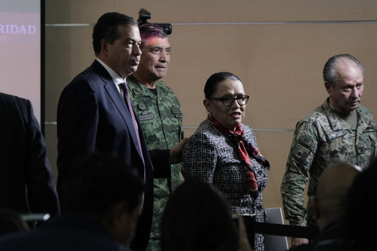 Mexická ministerka pre verejnú bezpečnosť Rosa Icela Rodriguez, v strede, a mexický minister obrany Luis Cresencio Sandoval, vzadu vľavo, odchádzajú po tlačovej konferencii oznamujúcej zatknutie Ovidia v Mexico City, štvrtok 5. januára 2023. Mexické bezpečnostné sily zajali Ovidia Guzmána , údajný obchodník s drogami hľadaný Spojenými štátmi a jeden zo synov bývalého šéfa kartelu Sinaloa Joaquína "El Chapo" Guzmána, vo štvrtok v rámci operácie pred úsvitom mimo Culiacan. Foto: SITA/AP
