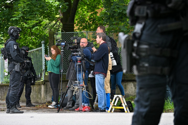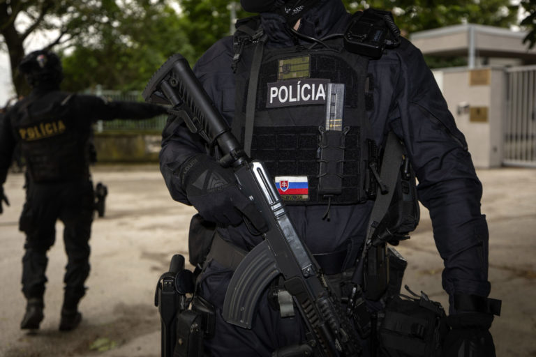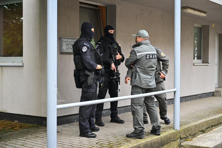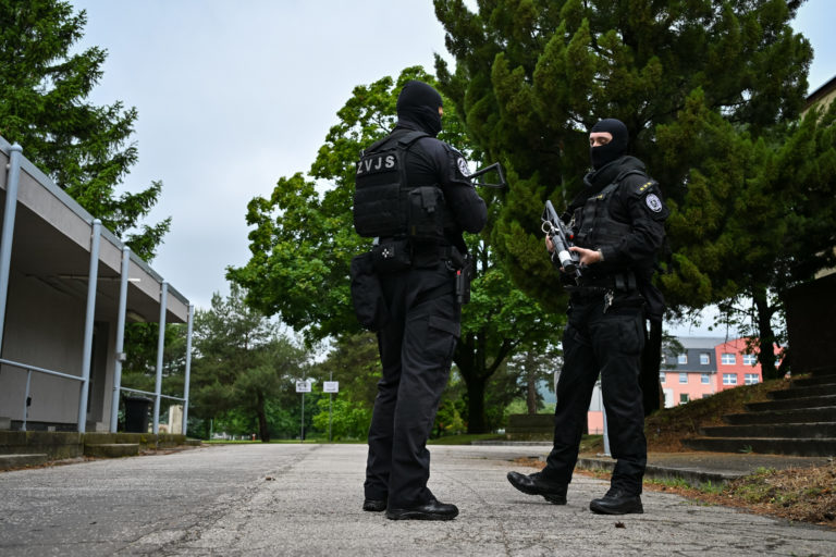 Bezpečnostné zložky zaisťujú okolie pred príchodom Juraja Cintulu obvineného z obzvlášť závažného zločinu úkladnej vraždy spáchanej v štádiu pokusu v prípade útoku na premiéra Roberta Fica na pojednávanie na Špecializovaný trestný súd (ŠTS) v Pezinku. Prokurátor žiada pre obvineného útekovú a preventívnu väzbu. Pezinok, 18. máj 2024. Foto: SITA.
