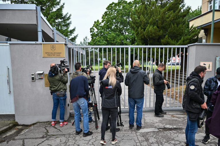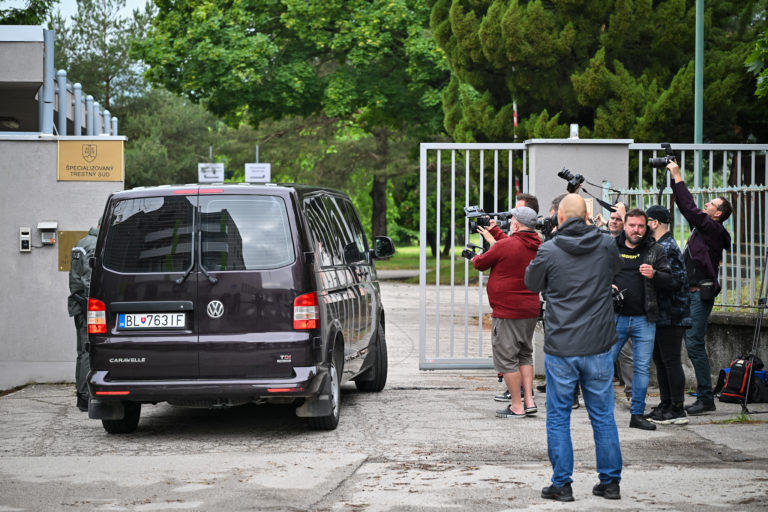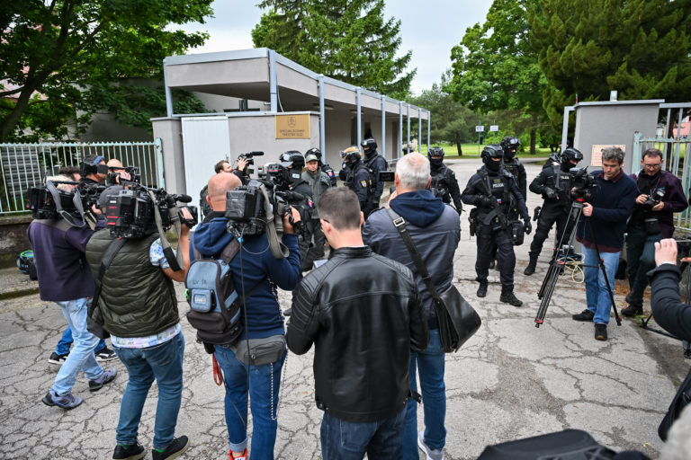 Atmosféra pred príchodom Juraja Cintulu obvineného z obzvlášť závažného zločinu úkladnej vraždy spáchanej v štádiu pokusu v prípade útoku na premiéra Roberta Fica na pojednávanie na Špecializovaný trestný súd (ŠTS) v Pezinku. Prokurátor žiada pre obvineného útekovú a preventívnu väzbu. Pezinok, 18. máj 2024. Foto: SITA.
