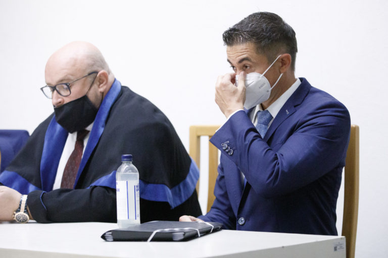 Obvinený bývalý štátny tajomník Radko K. (vpravo) pred začatím verejného zasadnutia o väzbe pre obvinených Radka K. a spol. v kauze Mýtnik 3 na Najvyššom súde. Bratislava, 16. august 2021. Foto: SITA/Branislav Bibel