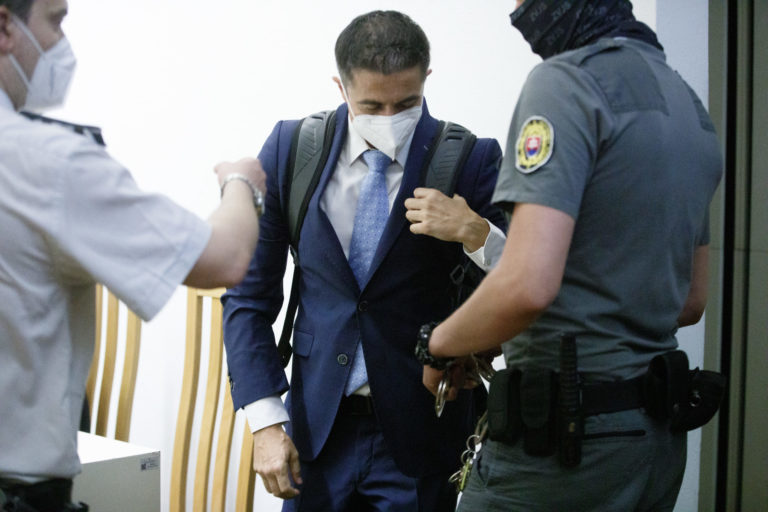 Obvinený bývalý štátny tajomník ministerstva financií SR Radko K. (uprostred) po rozhodnutí Najvyššieho súdu SR v rámci verejného zasadnutia o väzbe Radka K. a spol. v kauze Mýtnik 3. Najvyšší súd rozhodol, že Radko K. bude stíhaný väzobne. Bratislava, 16. august 2021. Foto: SITA/Branislav Bibel
