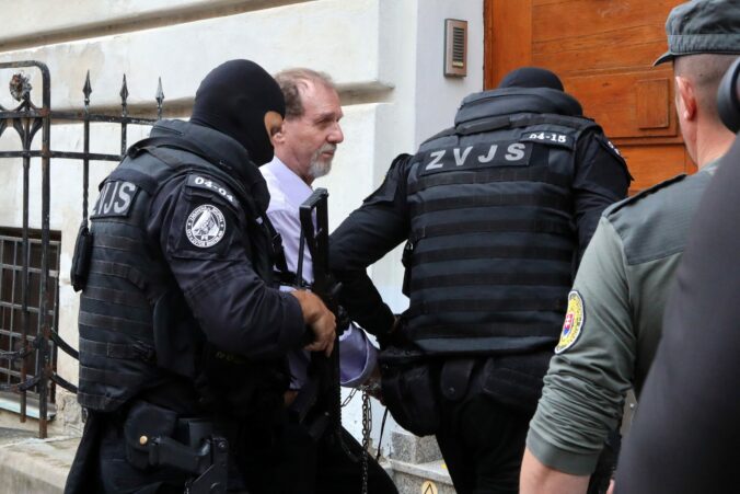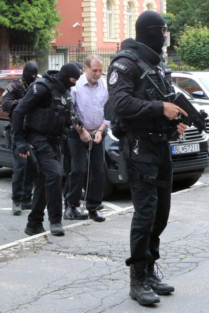 Juraj Cintula (uprostred) obžalovaný z obzvlášť závažného zločinu teroristického útoku spáchanom na chránenej osobe pred začatím procesu na Špecializovanom trestnom súde v Banskej Bystrici. Banská Bystrica, 8. júl 2025. Foto: archívne, SITA/Jakub Julény