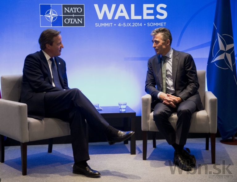 Zľava: generálny tajomník NATO Anders Fogh Rasmussen, nemecká kancelárka Angela Merkelová a britský premiér David Cameron počas summitu NATO vo Walese. Foto: SITA/AP