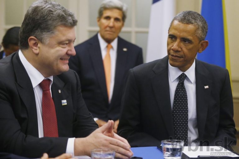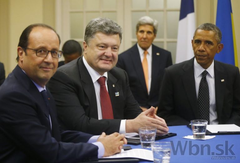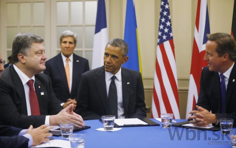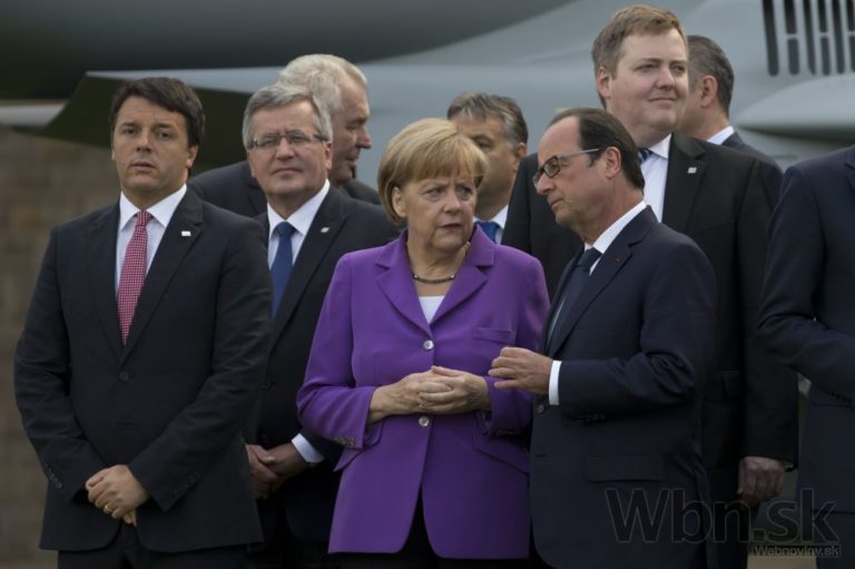 Zľava: Nemecá kancelárka Angela Merkelová počas rozhovoru s ukrajinským prezidentom Petrom Porošenkom na summite NATO vo Walese. Foto: SITA/AP