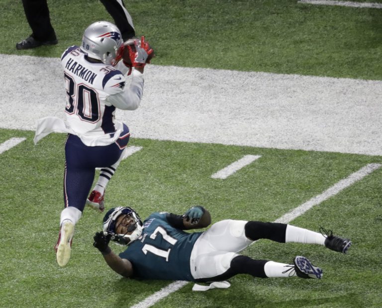 Alshon Jeffery z tímu Philadelphia Eagles padá po súboji s Duronom Harmonom z New England Patriots počas zápasu o Super Bowl LII. Minneapolis, 4. február 2018. Foto: SITA/AP.