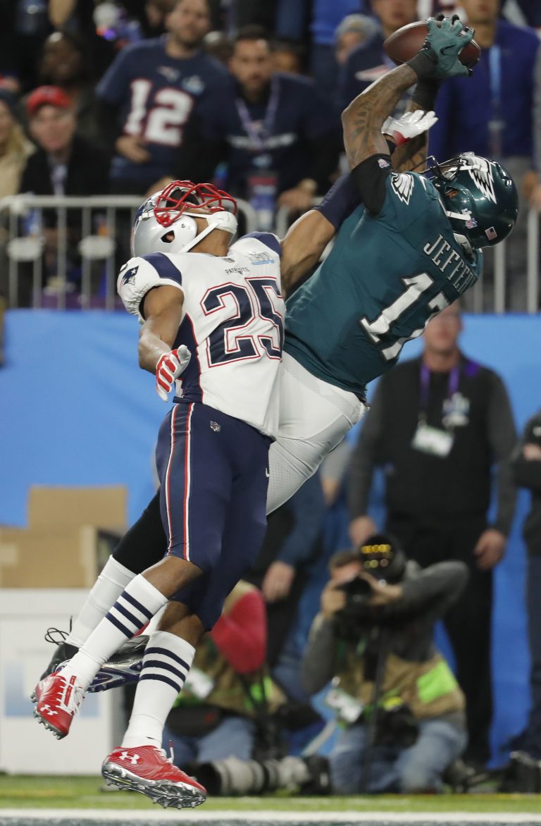 Eric Rowe (25) z New England Patriots nezabránil touchdownu Alshona Jefferyho počas zápasu o Super Bowl LII. Minneapolis, 4. február 2018. Foto: SITA/AP.