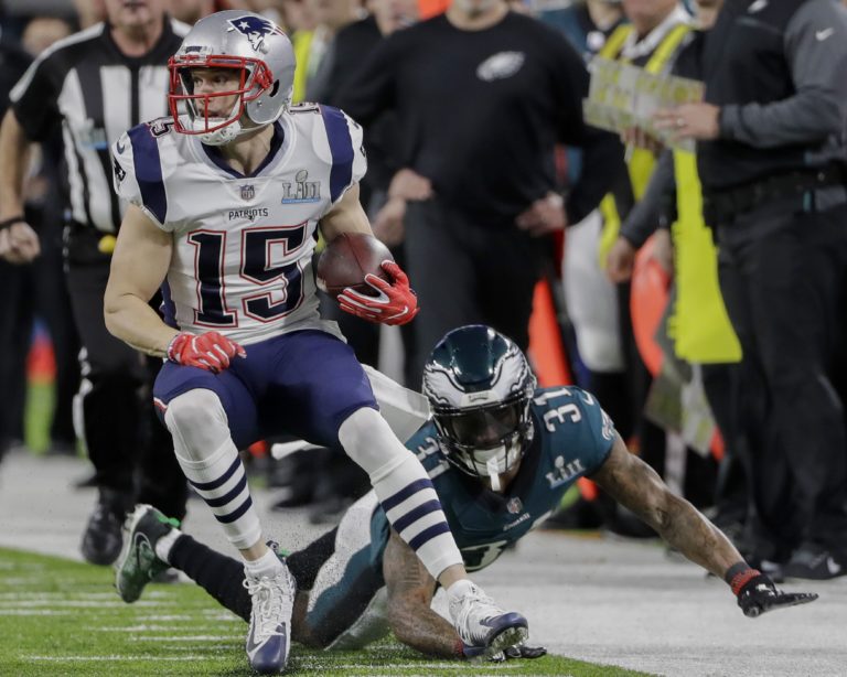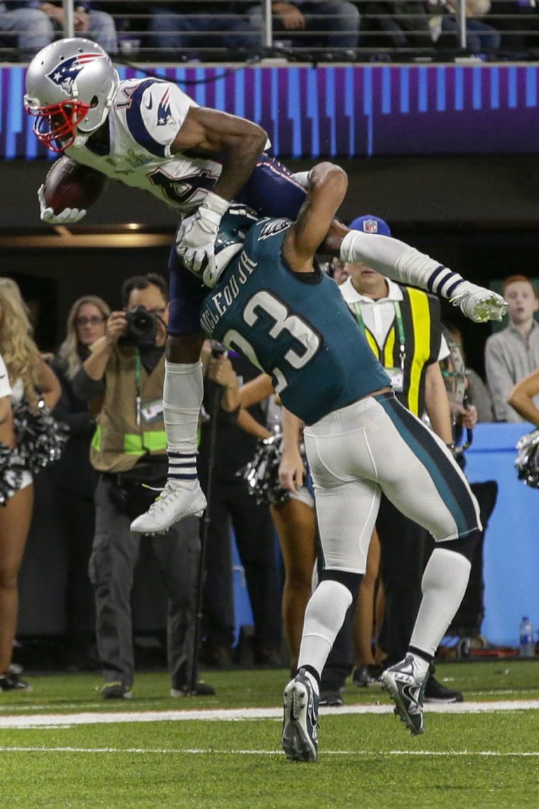 Danny Amendola (80) z New England Patriots v súboji s Patrickom Robinsonom z tímu Philadelphia Eagles počas zápasu o Super Bowl LII. Minneapolis, 4. február 2018. Foto: SITA/AP.