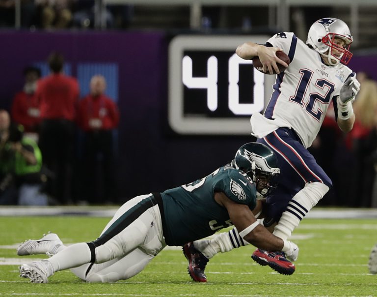 Brandon Graham z tímu Philadelphia Eagles zastavuje quarterbacka New England Patriots Toma Bradyho (12) počas zápasu o Super Bowl LII. Minneapolis, 4. február 2018. Foto: SITA/AP.