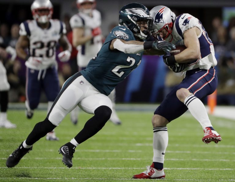 Jalen Mills z tímu Philadelphia Eagles v súboji s Robom Gronkowskim (87) z New England Patriots počas zápasu o Super Bowl LII. Minneapolis, 4. február 2018. Foto: SITA/AP.