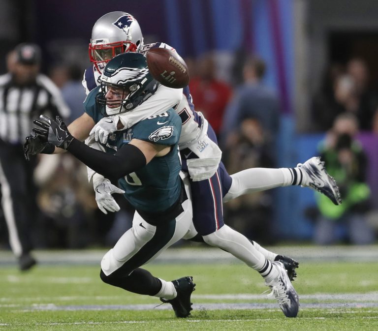 Devin McCourty z New England Patriots v súboji so Zachom Ertzom z tímu Philadelphia Eagles počas zápasu o Super Bowl LII. Minneapolis, 4. február 2018. Foto: SITA/AP.