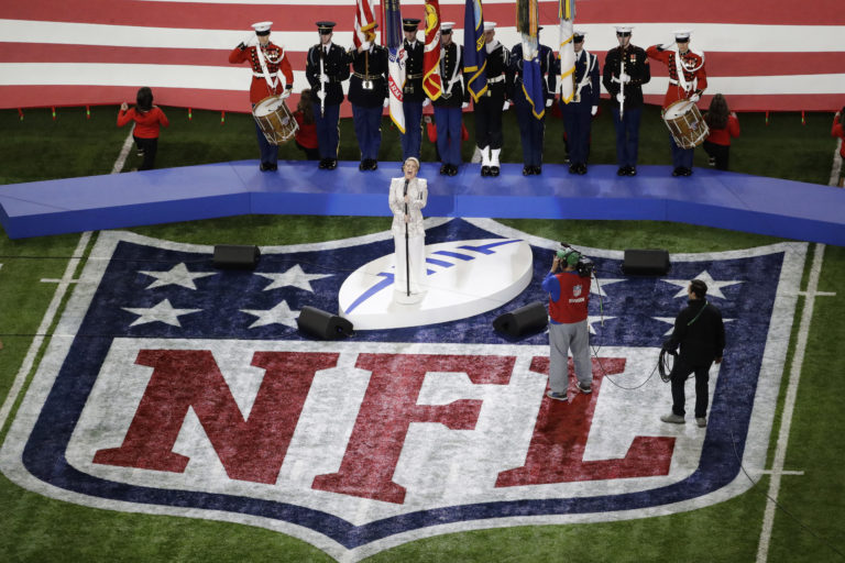 Speváčka Pink spieva americkú hymnu pred zápasom o Super Bowl LII medzi tímami Philadelphia Eagles a New England Patriots. Minneapolis, 4. február 2018. Foto: SITA/AP.