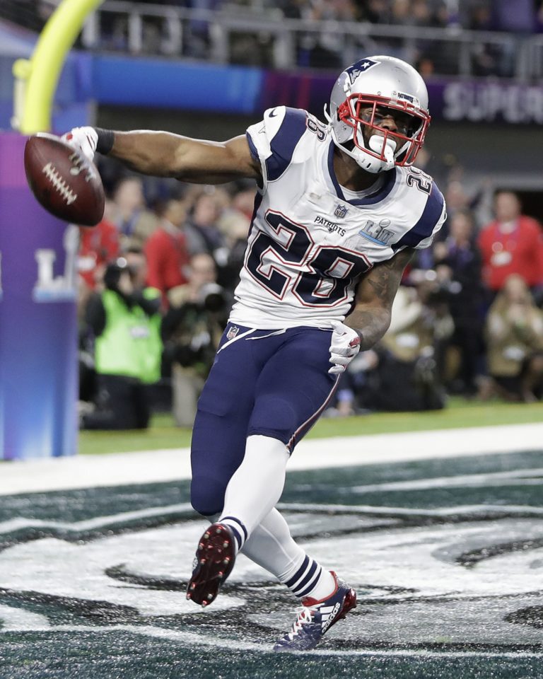 James White z New England Patriots sa teší z touchdownu počas zápasu o Super Bowl LII. Minneapolis, 4. február 2018. Foto: SITA/AP.