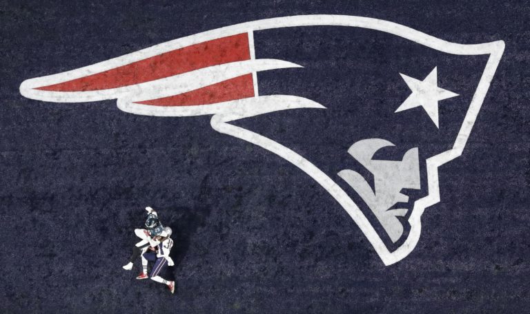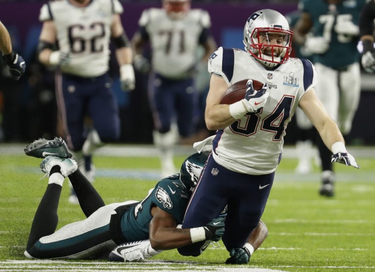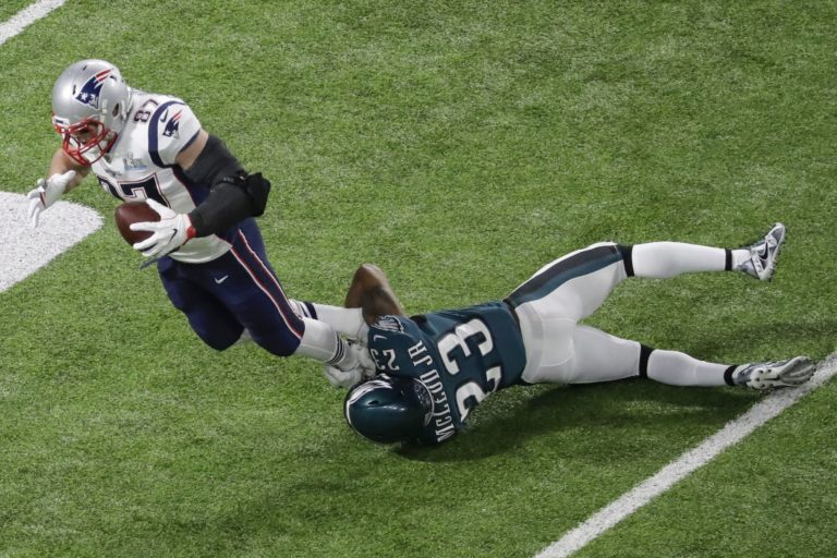 Rob Gronkowski (87) z tímu New England Patriots padá po súboji s Rodneym McLeodom Jr. počas zápasu o Super Bowl LII. Minneapolis, 4. február 2018. Foto: SITA/AP.