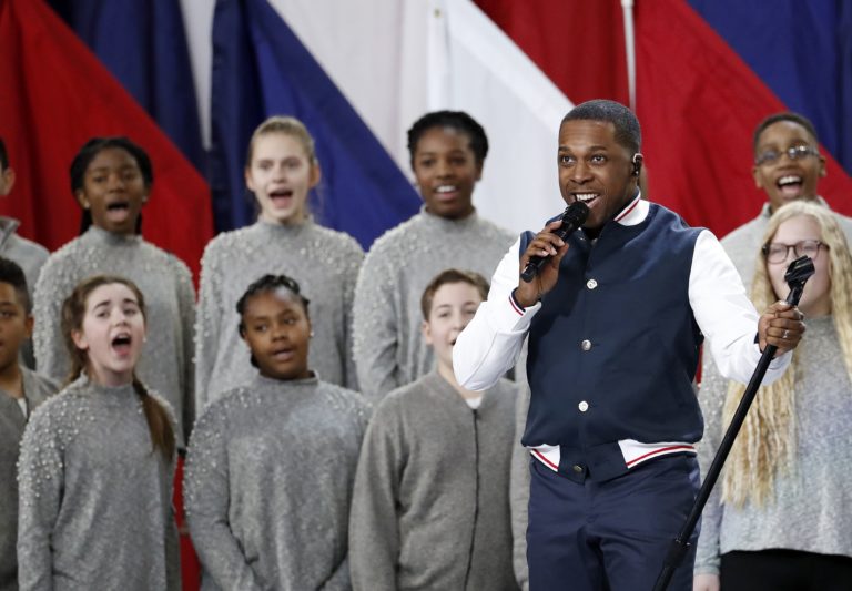 Leslie Odom Jr. spieva skladbu "America the Beautiful" pred zápasom o Super Bowl LII medzi tímami Philadelphia Eagles a New England Patriots. Minneapolis, 4. február 2018. Foto: SITA/AP.