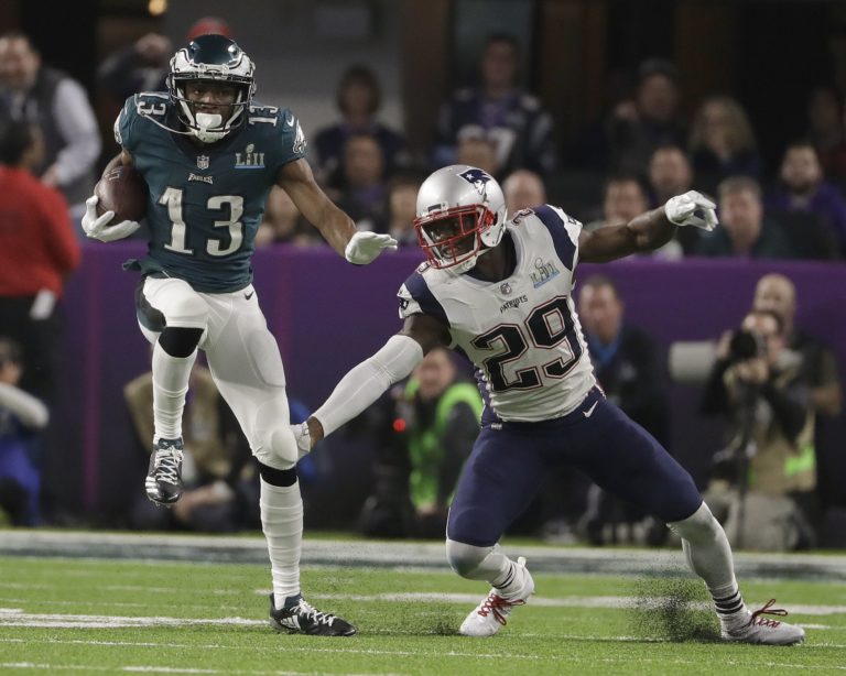 Nelson Agholor (13) z tímu Philadelphia Eagles uniká, Johnsonovi Bademosiovi z New England Patriots počas zápasu o Super Bowl LII. Minneapolis, 4. február 2018. Foto: SITA/AP.