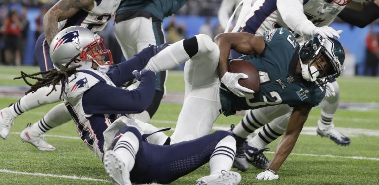 Jalen Mills z tímu Philadelphia Eagles sa snaží zastaviť Chrisa Hogana z New England Patriots počas zápasu o Super Bowl LII. Minneapolis, 4. február 2018. Foto: SITA/AP.