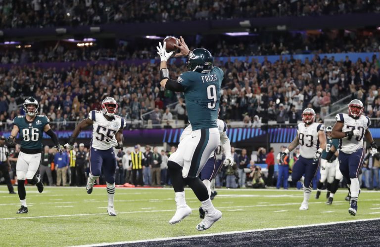 Touchdown quarterbacka tímu Philadelphia Eagles Nicka Folesa počas zápasu o Super Bowl LII. Minneapolis, 4. február 2018. Foto: SITA/AP.