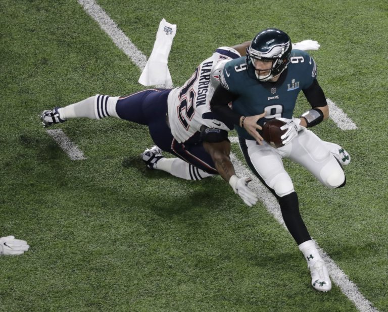 Quarterback Nick Foles z tímu Philadelphia Eagles uniká linebackerovi Jamesovi Harrisonovi z New England Patriots počas zápasu o Super Bowl LII. Minneapolis, 4. február 2018. Foto: SITA/AP.